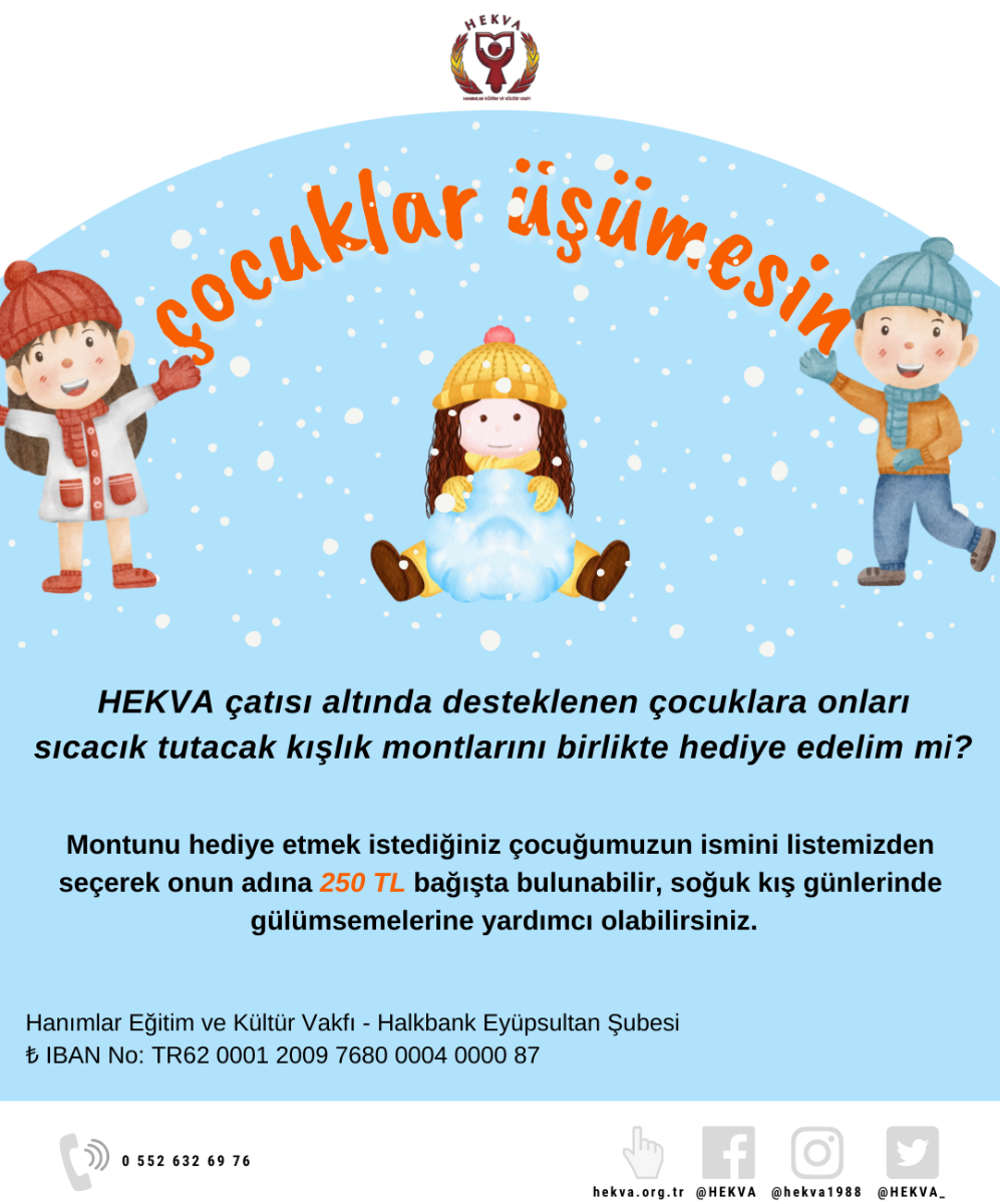 Çocuklar Üşümesin... Hanımlar Eğitim ve Kültür Vakfı’nın çatısı altında desteklediğimiz ihtiyaç sahibi aile çocuklarımız soğuk kış günlerinde, karda, yağmurda üşümesin, sıcacık gülümsesinler istiyoruz…